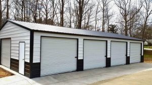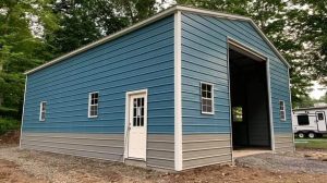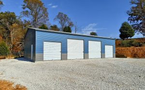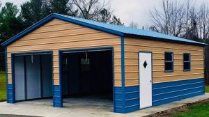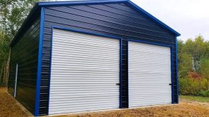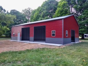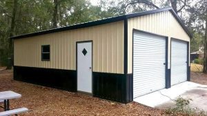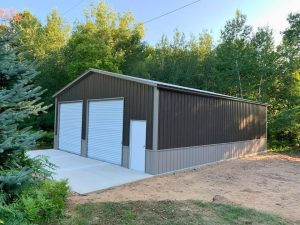 A Frame Vertical Roof, Vertical Siding, 12ft Leg Height, (2) 10’x10′ Garage Door, (1) Man Door, Two-Tone Wainscot
