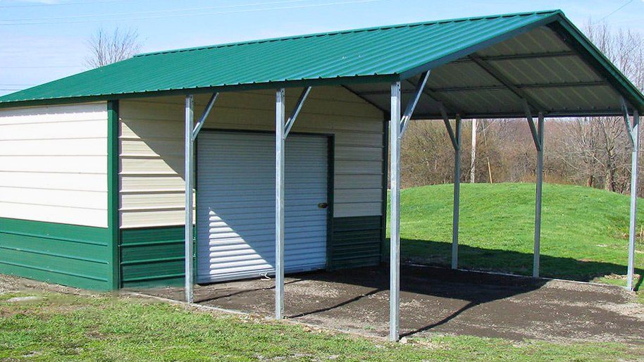 A Frame Vertical Roof, 8ft Leg Height, 10ft Storage Section, (1) 8’x7’ Garage Door, Two-Tone Wainscot