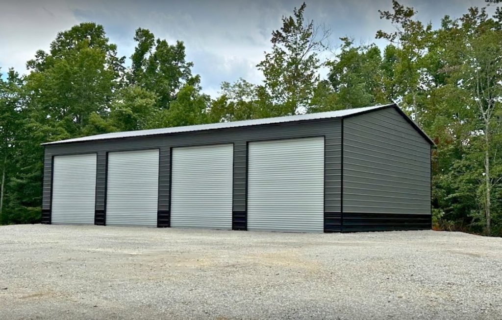 A Frame Vertical Roof, 16ft Leg Height, (4) 14’x14′ Garage Doors, Two-Tone Wainscot