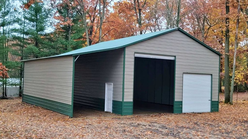 A Frame Vertical Roof, 16ft Leg Height, (1) 14’x14′ Garage Door, (1) 10’x10′ Garage Door, (1) Man Door, Two-Tone Wainscot, 12’x35′ Lean To, 16ft to 13ft Leg Height